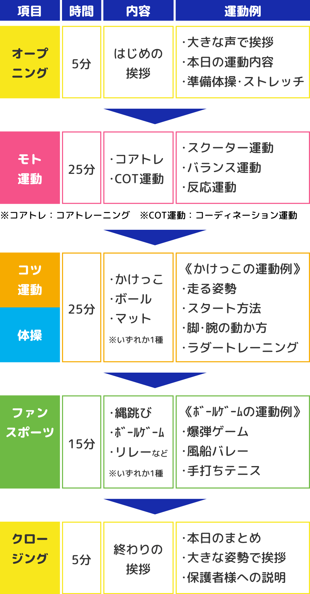 たくさんのスポーツにつながる”モト”となる基礎能力を高め、また、それぞれのスポーツに応じた上達のための”コツ”を習得します。