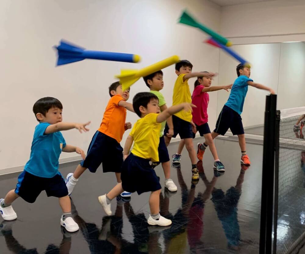 ボールを投げるには、腕の振り方(軌道)、下半身の使い方が重要。ロケットを使って投げる練習を行うことで、自然に正しい投げ方を身につけていきます。