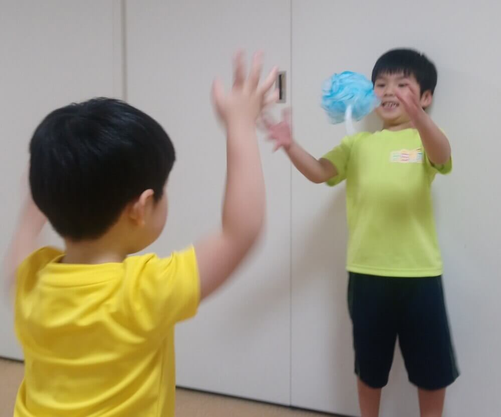 ボールを捕るには、構え、キャッチする場所、正しいタイミングが重要。ボールより簡単なタオルからスタートし”できた”をたくさん経験します。